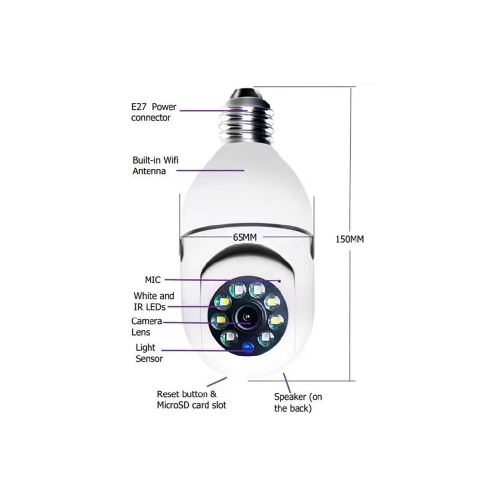 If you are looking to enhance your home security and peace of mind, our security camera bulb is the right investment for you. This device combines the functionality of a regular light bulb with the added security of a high-resolution camera. The security camera bulb is easy to install, simply screw it into any standard light socket and connect it to your home's Wi-Fi network. Once connected, you can remotely access the live feed from any of your iPhone or Android devices . The security camera bulb also features motion detection and night vision, so you can be notified when there is movement in your home and see what's happening even in the dark. This device is a perfect solution for those who want to keep an eye on their home, even when they're away. Order yours today and enjoy the peace of mind that comes from knowing that your home is always being monitored. Features: audio and video recording, screenshot capabilities, ability to speak through camera to its surroundings, settings that can manually or automatically change from night mode to smart mode, motion and sound detection, and a siren to send an alert if necessary. Specifications Product Dimensions: 6.89 x 4.17 x 3.82 inches Product Weight: 12.1oz.